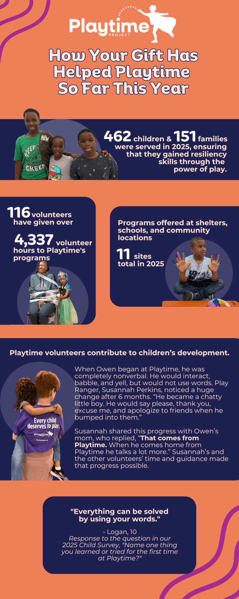 Thanks to the support of generous staff, volunteers, and donors, Playtime made a huge impact in 2024.